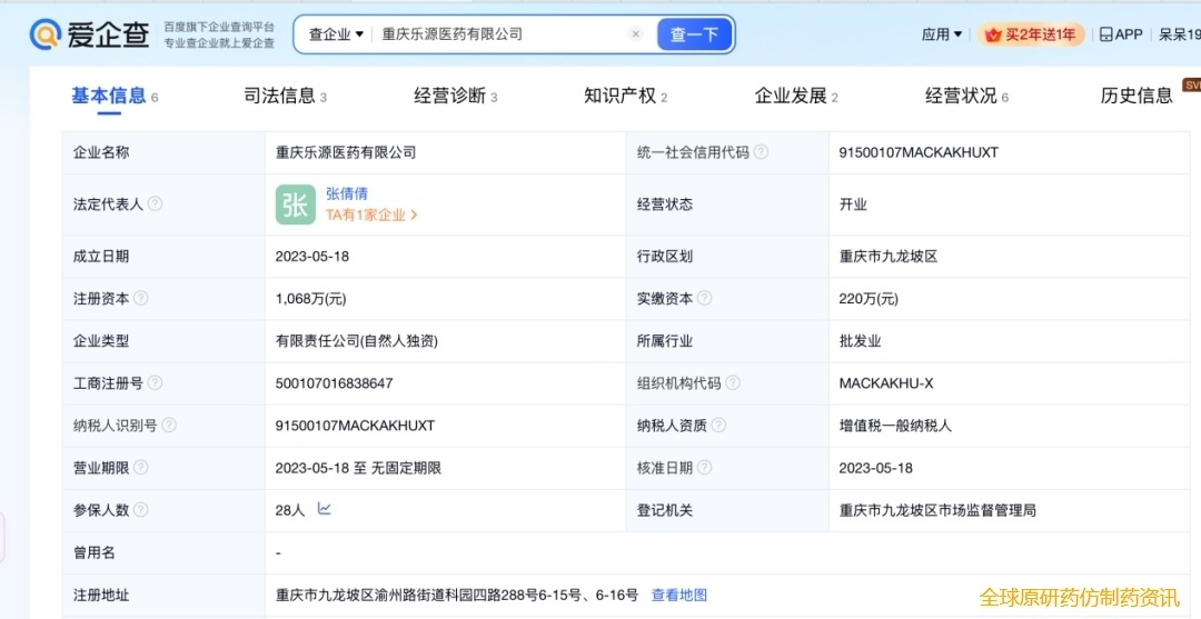 另据《爱企查》资料,另一涉案药企重庆乐源医药有限公司成立于2023年05月18日,注册地位于重庆市九龙坡区渝州路街道科园四路288号6-15号、6-16号,法定代表人为张倩倩。张倩倩也是该公司唯一股东。