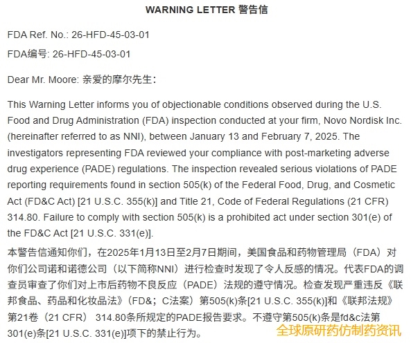 2026年3月,医药资本市场再度被一只“黑天鹅”惊扰。就在几天前,全球“减肥药之王”诺和诺德的股价在单日内应声下跌超 3%,数十亿美元市值瞬间蒸发。引发这场震荡的,不是临床试验的失败,也不是供应链的断裂,而是一纸来自美国FDA科学调查办公室、长达8页的严厉警告信。