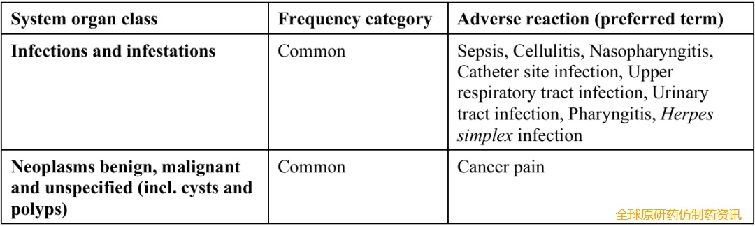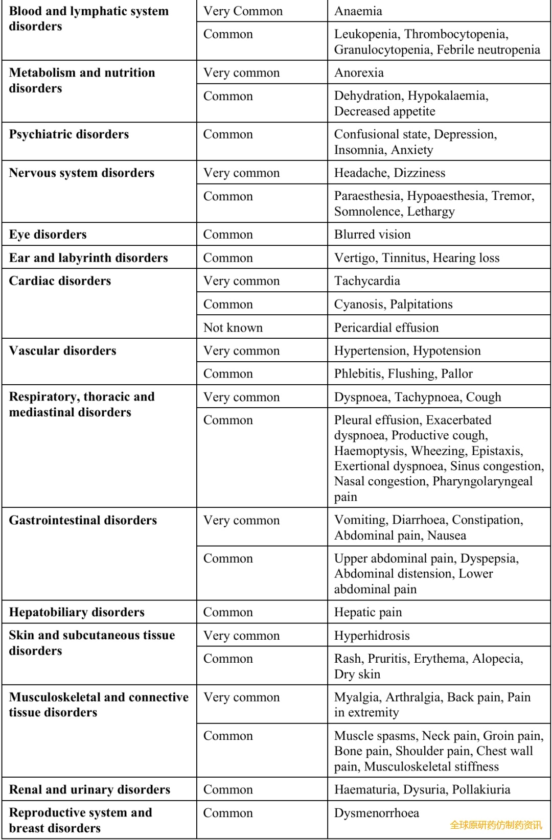 不良反应按系统器官分类和频率列出。频率分组根据以下惯例定义:非常常见 (≥1/10),常见 (≥1/100 至 <1/10),未知(无法根据现有数据估计)。在每个频率分组中,不良反应按严重性递减顺序列出。