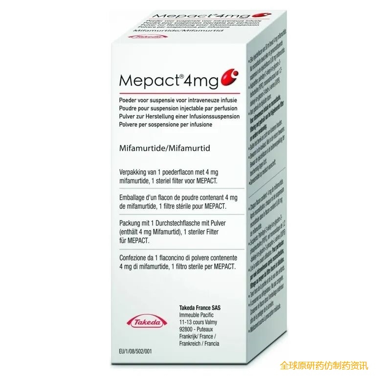武田制药公司(Takeda)米伐木肽注射剂(英文名称:mifamurtide,或L-MTP-PE,或Mepact),用于治疗非转移性可切除的骨肉瘤(少见但主要造成儿童和青年死亡的骨瘤)。