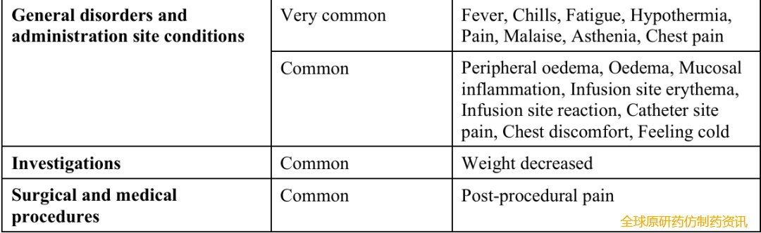 大多数患者会出现寒战 (89%)、发热 (85%) 和疲劳 (53%)。这些反应通常为轻度至中度、一过性,并且通常对姑息治疗(例如,对乙酰氨基酚退热)有反应。通常为轻度至中度且非常常见的其他全身性症状包括体温过低 (23%)、不适 (13%)、疼痛 (15%)、无力 (13%) 和胸痛 (11%)。在这些患者中,水肿、胸部不适、局部输注或导管部位反应以及“感觉寒冷”的报告较少见,多数发生在晚期恶性疾病患者中。