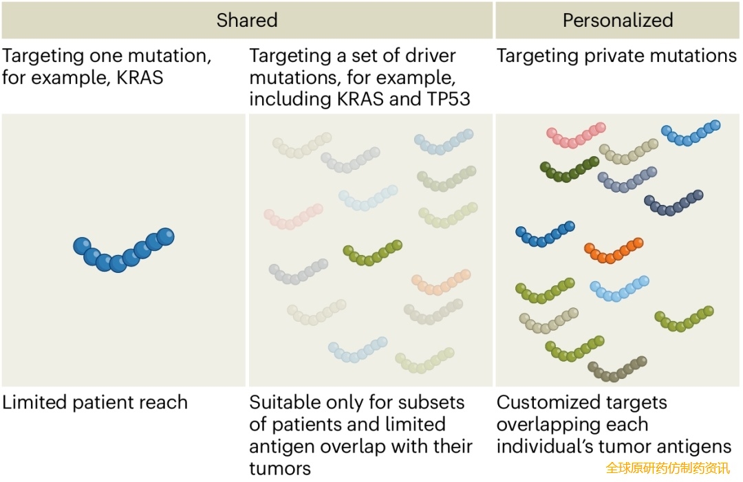 图1. 共享疫苗与个体化疫苗中的靶向新抗原。共享的即用型疫苗通常仅靶向由驱动突变编码的一种新抗原。它们可以由单一抗原(左)或一组抗原(中)组成。混合型共享疫苗适用于更大范围的患者,但其大部分抗原由个体患者肿瘤中不存在的突变编码。相比之下,个体化癌症疫苗(PCV)(右)是定制的,主要靶向根据其在个体患者肿瘤中存在与否而选择的私有突变。