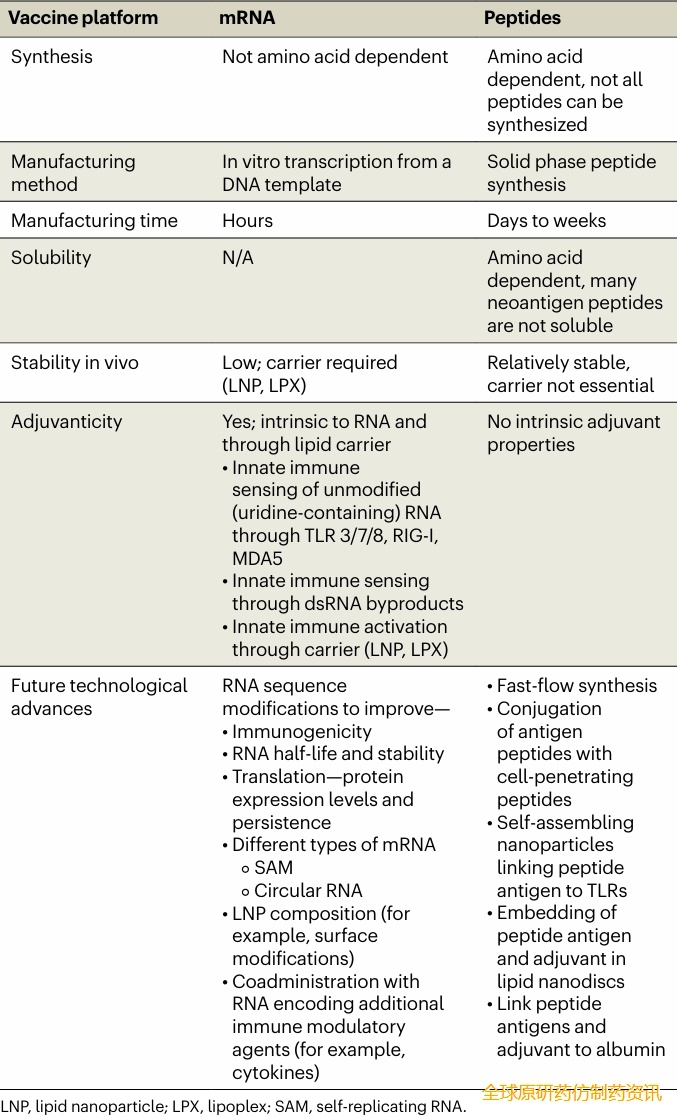 肽作为PCV递送平台的局限性包括氨基酸序列特异性的药理学挑战和相对较长的生产时间,通常为数周。时间延迟以及无法合成和溶解由新抗原发现管道产生的许多精心挑选的新抗原候选物,是个体化疫苗领域的局限性。对于具有高肿瘤突变负荷(TMB)的肿瘤,如黑色素瘤和NSCLC,针对多抗原的个体化肽疫苗的序列特异性合成限制可能会影响免疫原性(一些预测的免疫原性新表位无法包含在内),同时可能阻碍在具有低TMB且推定新抗原靶点可用性有限的肿瘤中完全生成此类疫苗。此外,肽疫苗可以包含的新抗原靶点的最大数量也受到药理学限制,最显著的是溶解度。