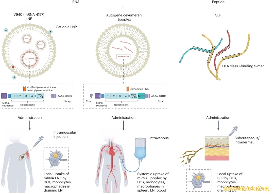 图2. RNA和肽新抗原疫苗的组成与给药。在当前的新抗原疫苗配方中,本质上不稳定的RNA使用脂质体-LNP(例如,mRNA-4157,Moderna;左)或脂质复合物(例如,autogene cevumeran,BioNTech;中)进行递送。