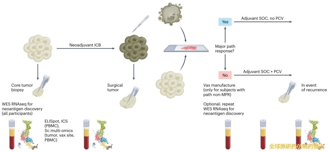图4. 围手术期风险适应性PCV临床试验设计与生物样本收集。可手术切除肿瘤的患者入组试验并接受新辅助ICB。达到MPR的患者根据SOC接受辅助治疗或监测,但不接受PCV。未达到MPR的患者接受辅助PCV,联合或不联合标准辅助治疗。