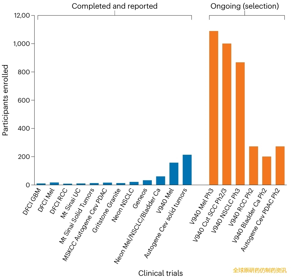 图3. PCV临床试验入组人数:过去与未来。已完成临床试验的参与者人数与正在进行的测试基于RNA的PCV的最大型临床试验中选定的目标入组人数对比。GBM,胶质母细胞瘤;MSKCC,纪念斯隆-凯特琳癌症中心;Autogene Cev,autogene cevumeran;Neon,Neon Therapeutics;V940,Moderna/Merck个体化mRNA新抗原疫苗;膀胱癌,膀胱癌。