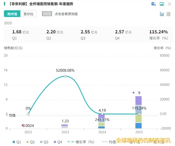 从临床机制上看,非奈利酮是全球首个且唯一的非甾体类选择性盐皮质激素受体(MR)拮抗剂。为了让大家听得懂,打个比方:传统的甾体类药物(如螺内酯)就像是全图无差别攻击的火炮,虽然能打病灶,但也容易误伤友军(引发高钾血症等副作用);而非奈利酮则像是装了精确制导的导弹,直接靶向心脏和肾脏的MR受体,阻断炎症和纤维化。这种降维打击般的技术壁垒,让其在国内上市后销售额一路狂飙,据公开数据显示,2025年国内全终端市场销售额已近9亿元人民币,年增长率超过115%。