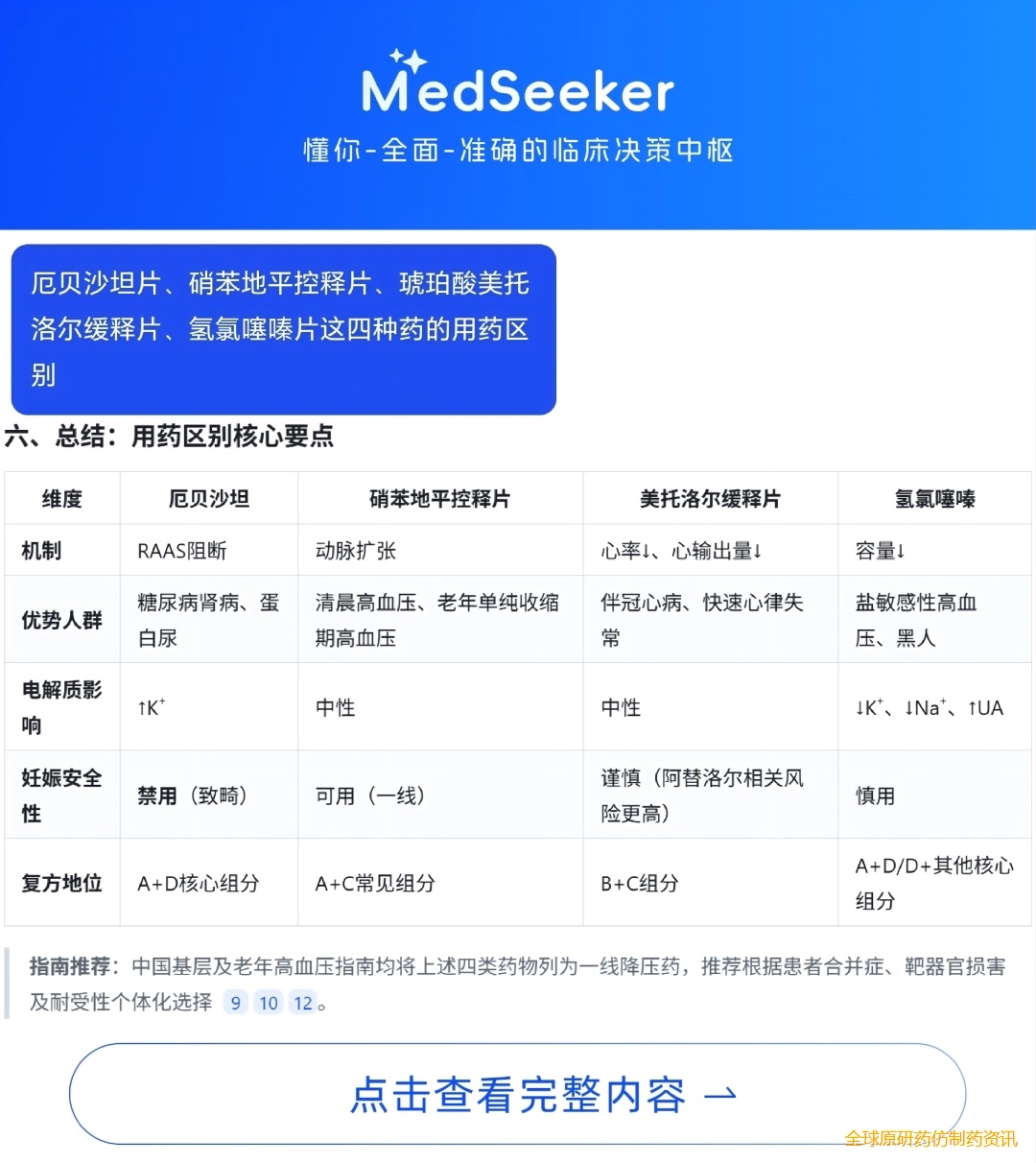 而本功能的“王牌”亮点在于一键生成多药对比表格。当您需要在多种同类药物(如几种不同种类的降压药、抗生素)之间做出最优选择时,无需再手动整理。只需选定您想对比的几种药物,AI助手便能立即为您生成一份结构化的核心参数对比表格,其中清晰罗列了适应症、关键不良反应、禁忌症、特殊人群用药建议等核心维度,以最直观、最高效的方式,辅助您进行循证决策,显著提升处方质量和用药安全。