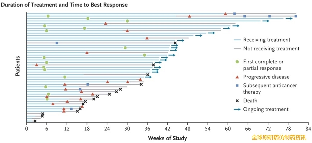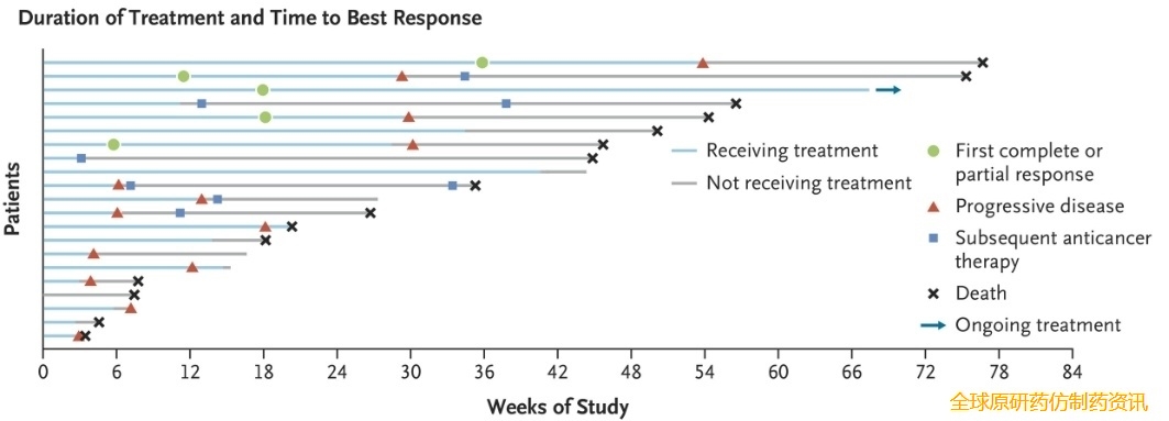 在非小细胞肺癌患者中,45例接受600mg剂量治疗的患者被纳入疗效分析,16位患者部分缓解,客观缓解率36%,中位无进展生存期8.3个月,中位总生存期尚未达到,1年生存率为59%。