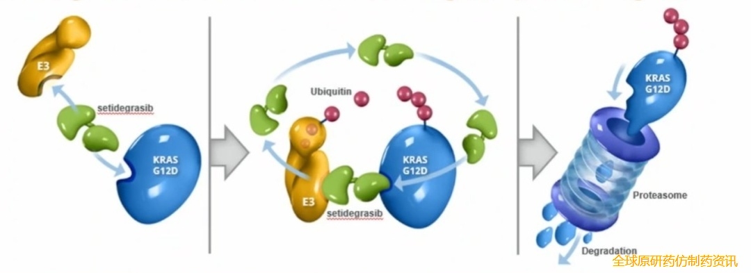 与两位前辈不同,今天的主角setidegrasib更加简单粗暴。它能直接连接KRAS G12D突变蛋白和E3泛素连接酶,诱导KRAS G12D蛋白的降解,从而阻断致癌信号。